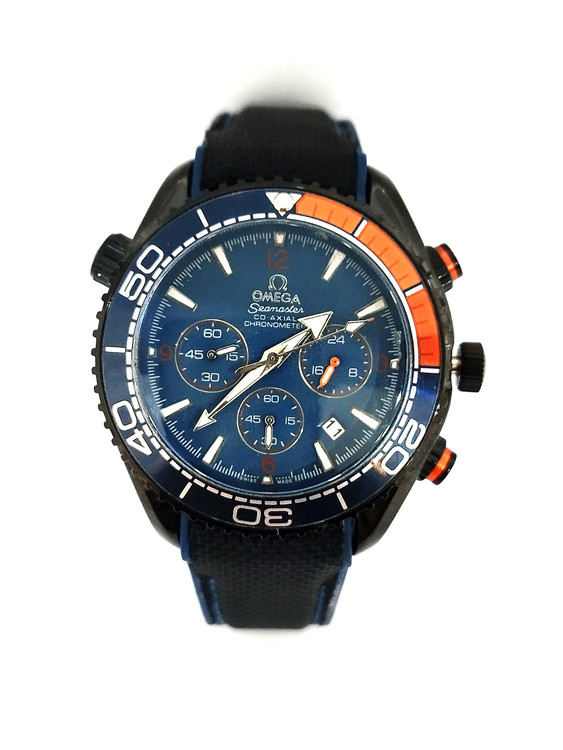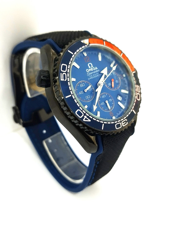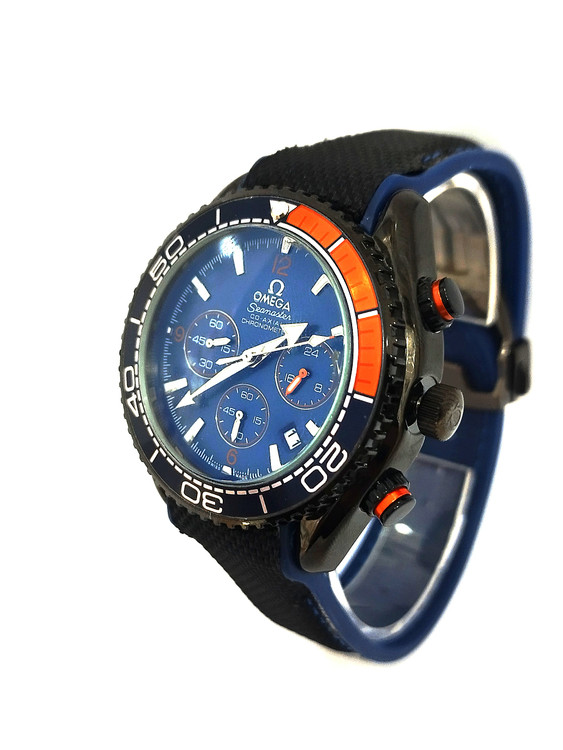 ساعت مچی پسرانه و دخترانه برند امگا سه موتوره بند سیلیکونی نخی در رنگ نارنجی مشکی و صفحه آبی نفتی