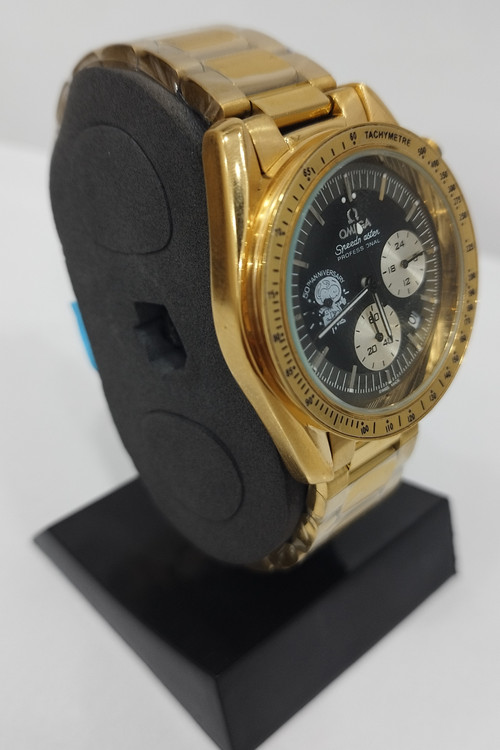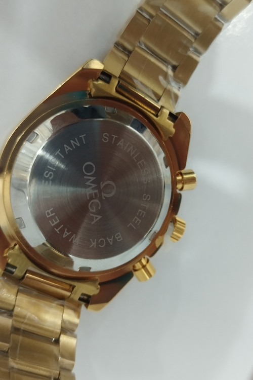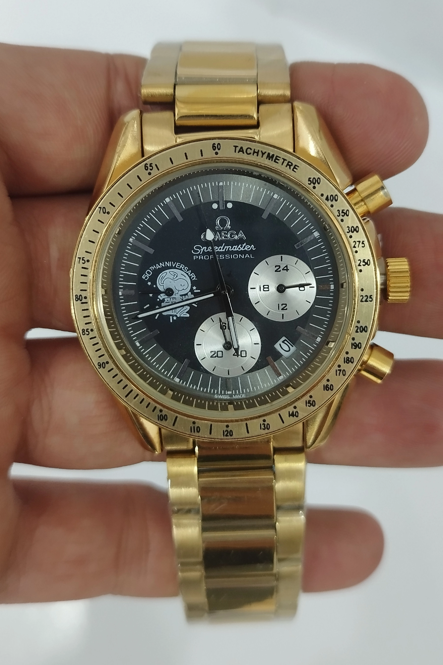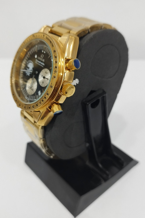ساعت مچی مردانه برند امگا omega در رنگ طلایی بند استیل و صفحه مشکی رنگ