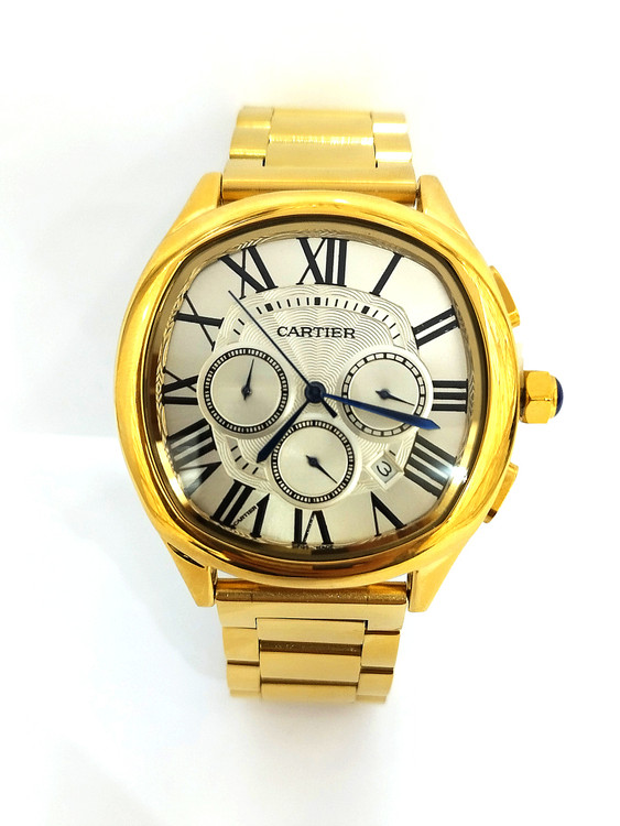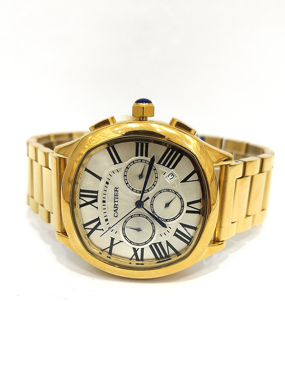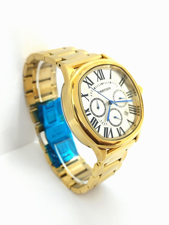 ساعت مچی پسرانه و دخترانه برند کارتیر سه موتوره بند فلزی استیل در رنگ طلایی و صفحه سفید صدفی