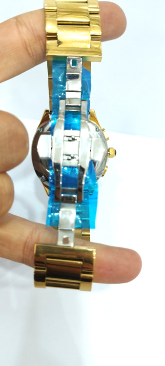 رنگ ثابت با ضمانت شیشه کریستال تلسکوپی ضد خش ضد آب در حد شستشو سه موتور روز شمار سه موتور فعال تقویم دار ثانیه شمار بند استیل رنگ طلایی قفل پروانه ای جدید موتور کوارتز نوع کار موتور همراه باطری