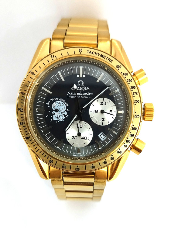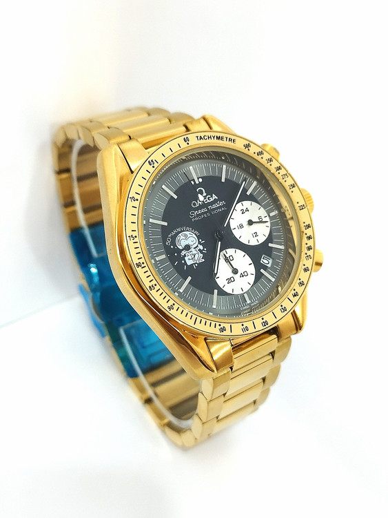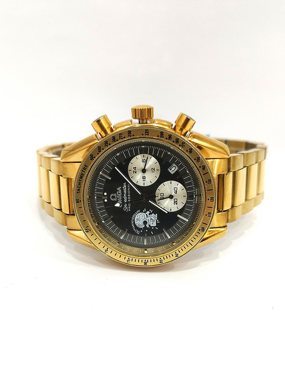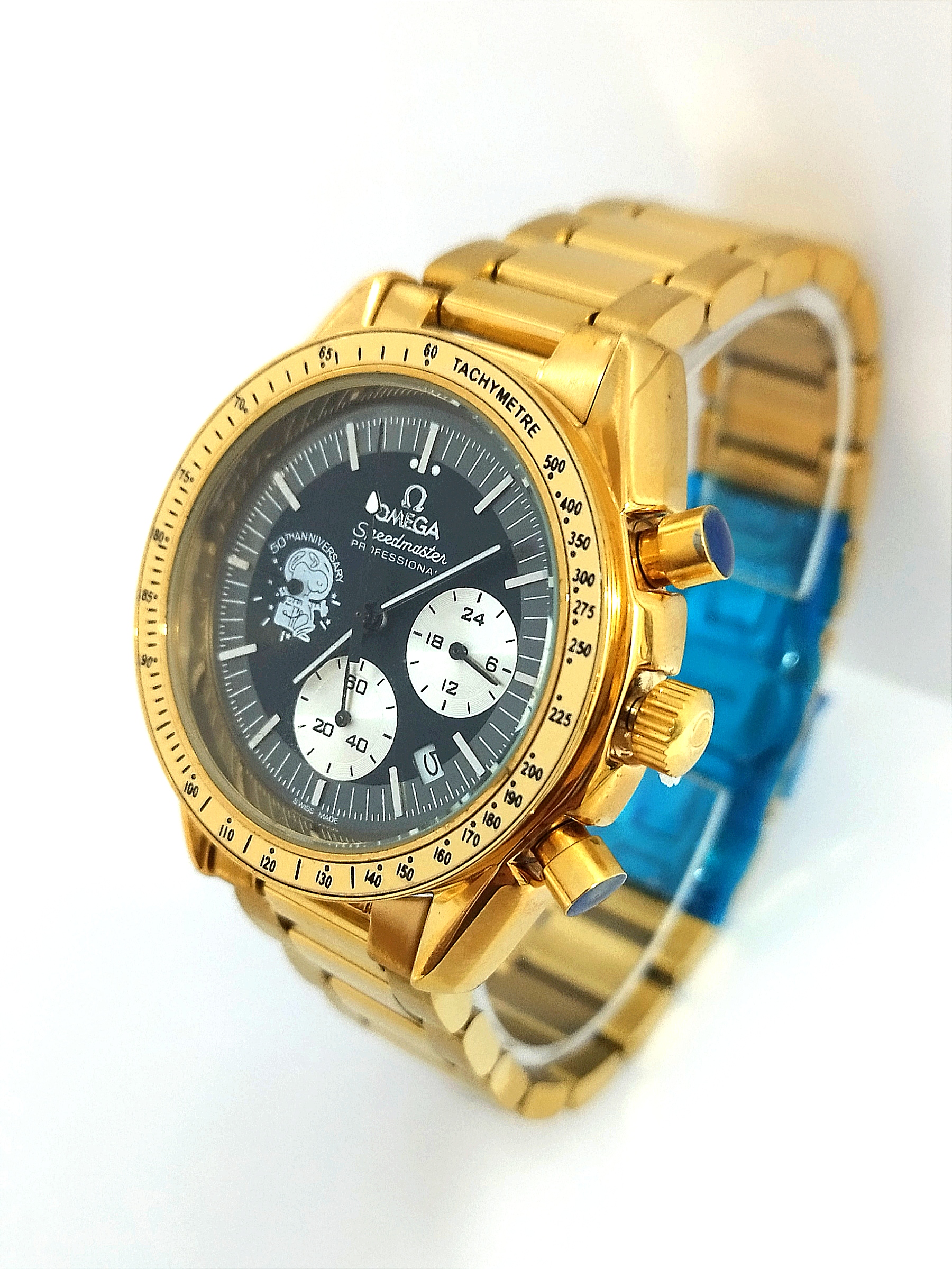 ساعت مچی پسرانه و دخترانه برند امگا سه موتوره فعال بند فلزی استیل در رنگ طلایی و صفحه مشکی رنگ
