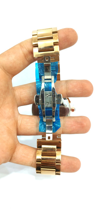 رنگ ثابت با ضمانت شیشه کریستال تلسکوپی ضد خش ضد آب در حد شستشو سه موتور روز شمار سه موتور فعال تقویم دار ثانیه شمار بند استیل رنگ رزگلد قفل پروانه ای جدید موتور کوارتز نوع کار موتور همراه باطری