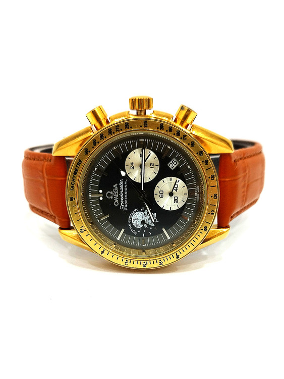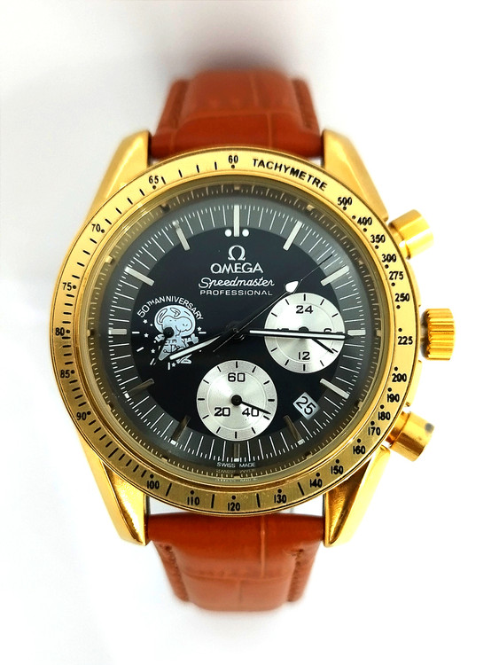 ساعت مچی پسرانه و دخترانه برند امگا سه موتوره بند چرم اصل رنگ قهوه ای روشن و دور صفحه طلایی و صفحه مشکی