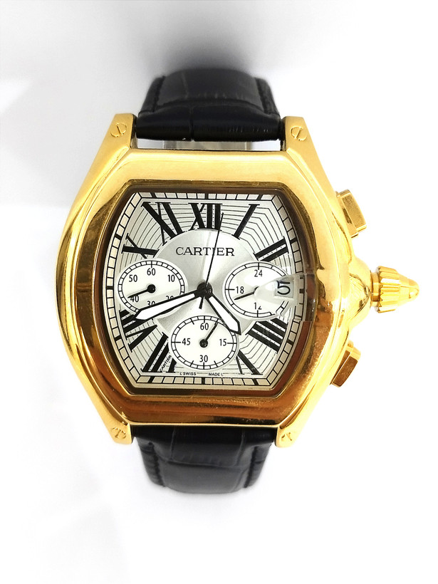 ساعت مچی مردانه و پسرانه برند کارتیر در رنگ مشکی بند چرم اصل و دور صفحه طلایی و صفحه سفید رنگ