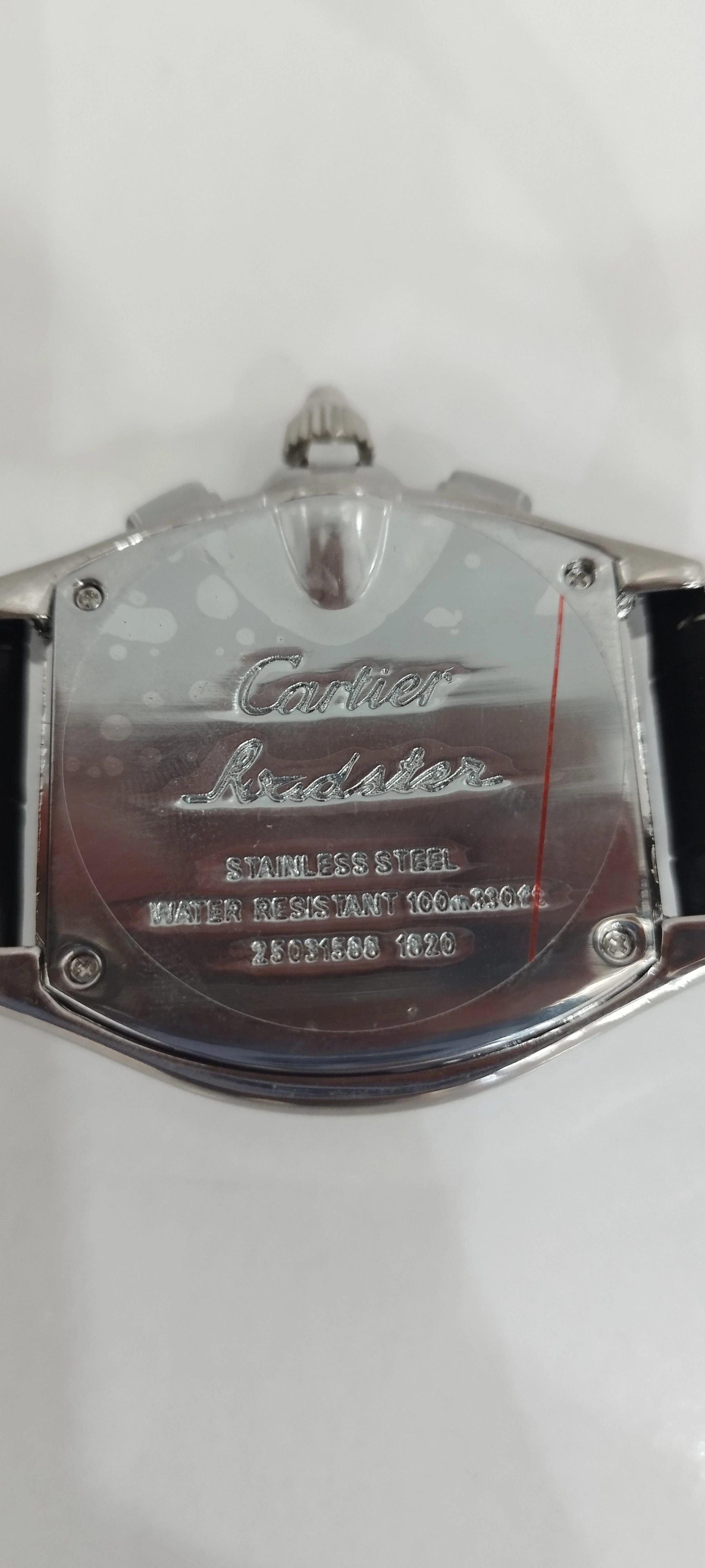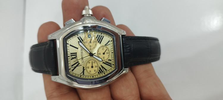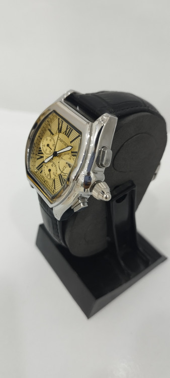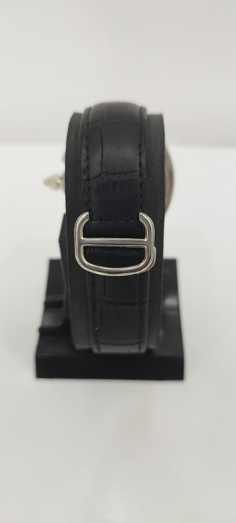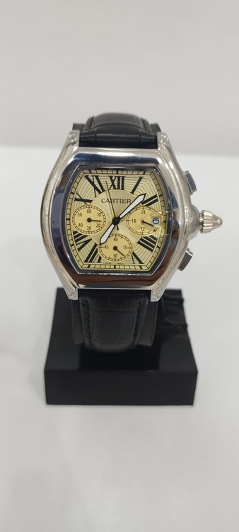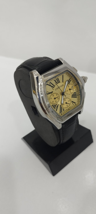 ساعت مچی مردانه و زنانه برند کارتیر CARTIER سه موتوره ضد آب بند چرم اصل رنگ مشکی و دور صفحه نقره ای و صفحه زرد کم رنگ