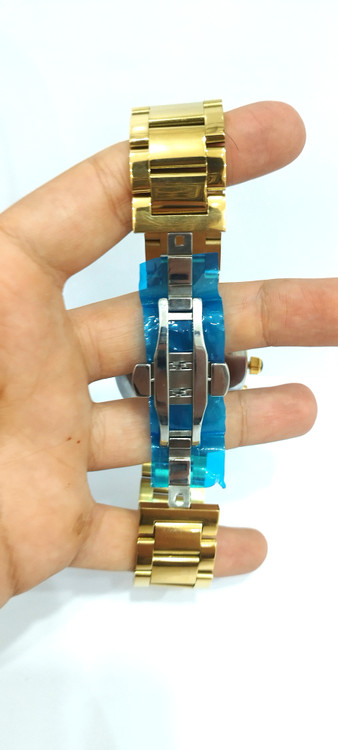 رنگ ثابت با ضمانت شیشه کریستال تلسکوپی ضد خش ضد آب در حد شستشو سه موتور روز شمار سه موتور فعال تقویم دار ثانیه شمار بند استیل رنگ طلایی قفل پروانه ای جدید موتور کوارتز نوع کار موتور همراه باطری