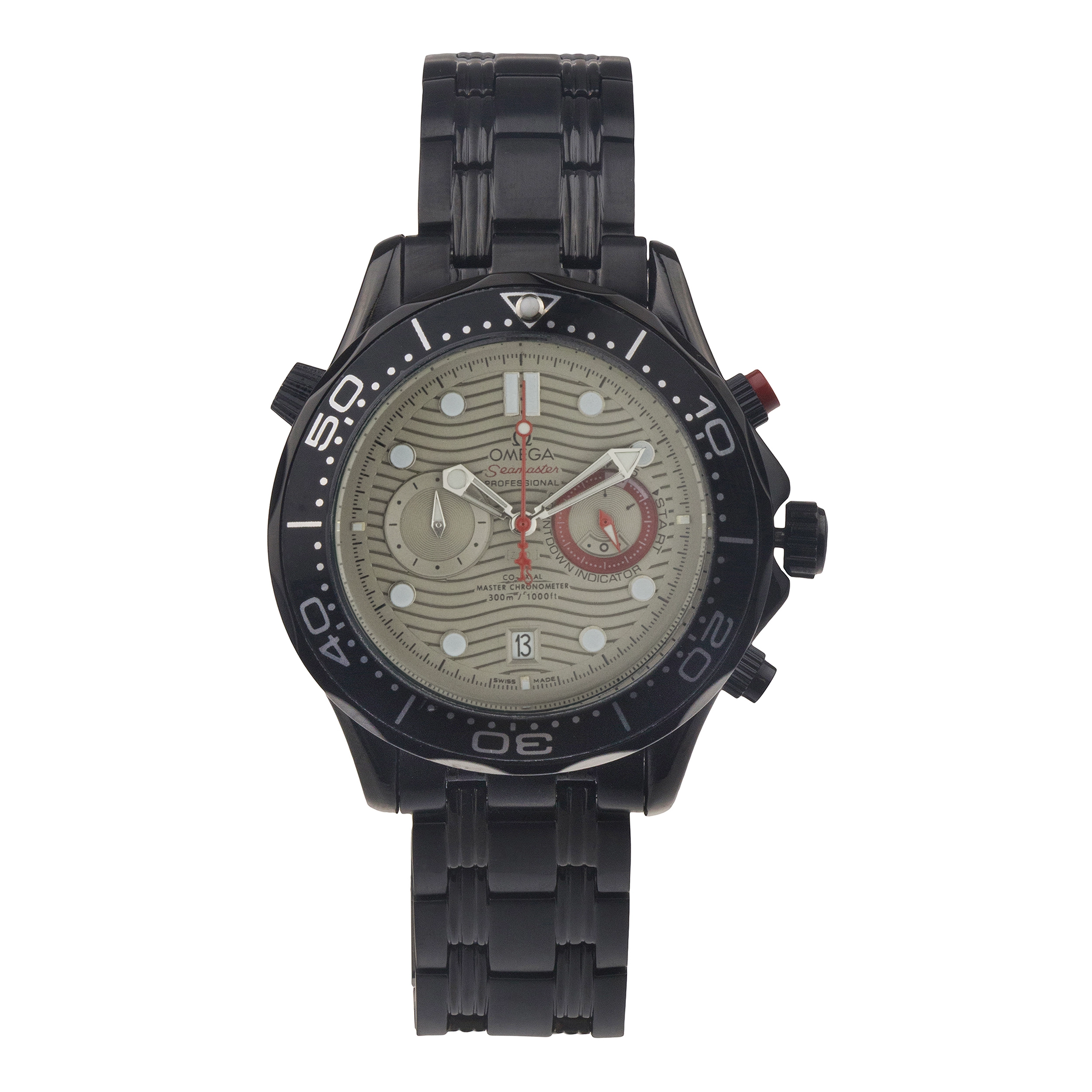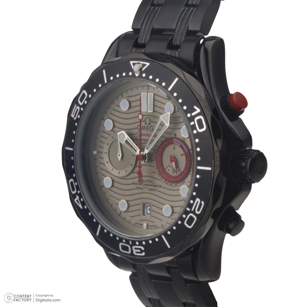ساعت مچی پسرانه و دخترانه برند امگا سه موتوره بند استیل رنگ مشکی و صفحه خاکستری رنگ