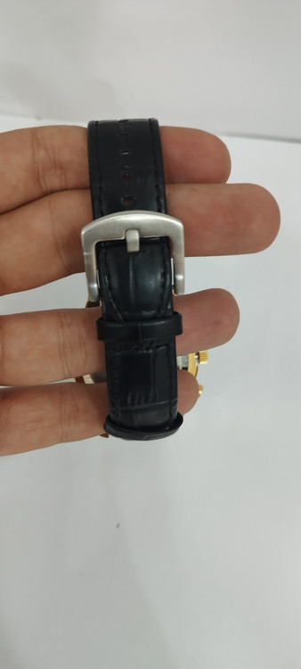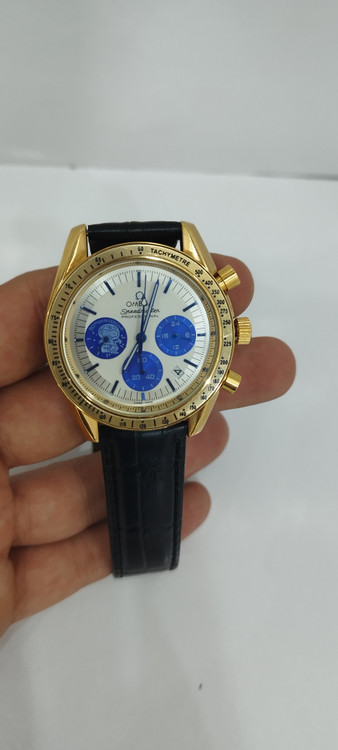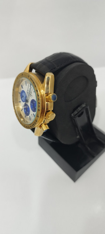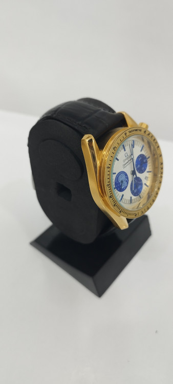 ساعت مچی مردانه و زنانه برند امگا OMEGA ضد آب و سه موتوره فعال بند چرم اصل رنگ مشکی و دور صفحه زرد رنگ و صفحه سفید رنگ.