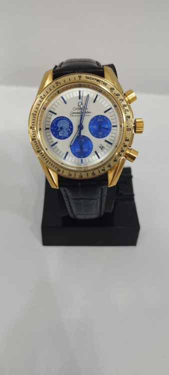 ساعت مچی مردانه و زنانه برند امگا OMEGA ضد آب سه موتوره فعال بند چرم اصل رنگ مشکی و دور صفحه زرد رنگ و صفحه سفید رنگ.