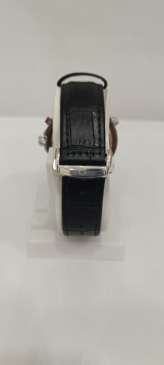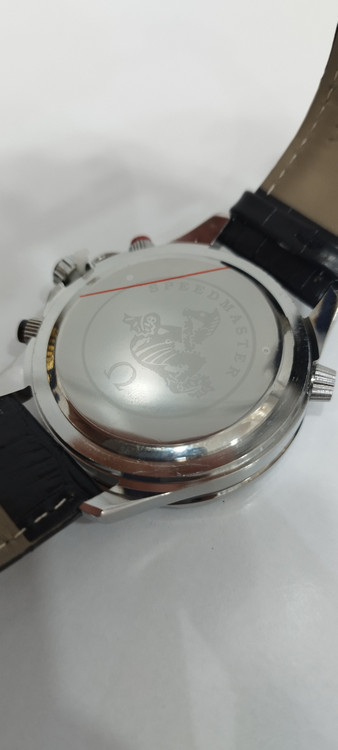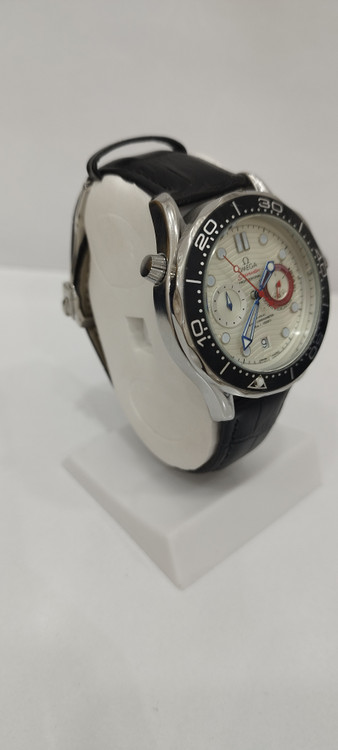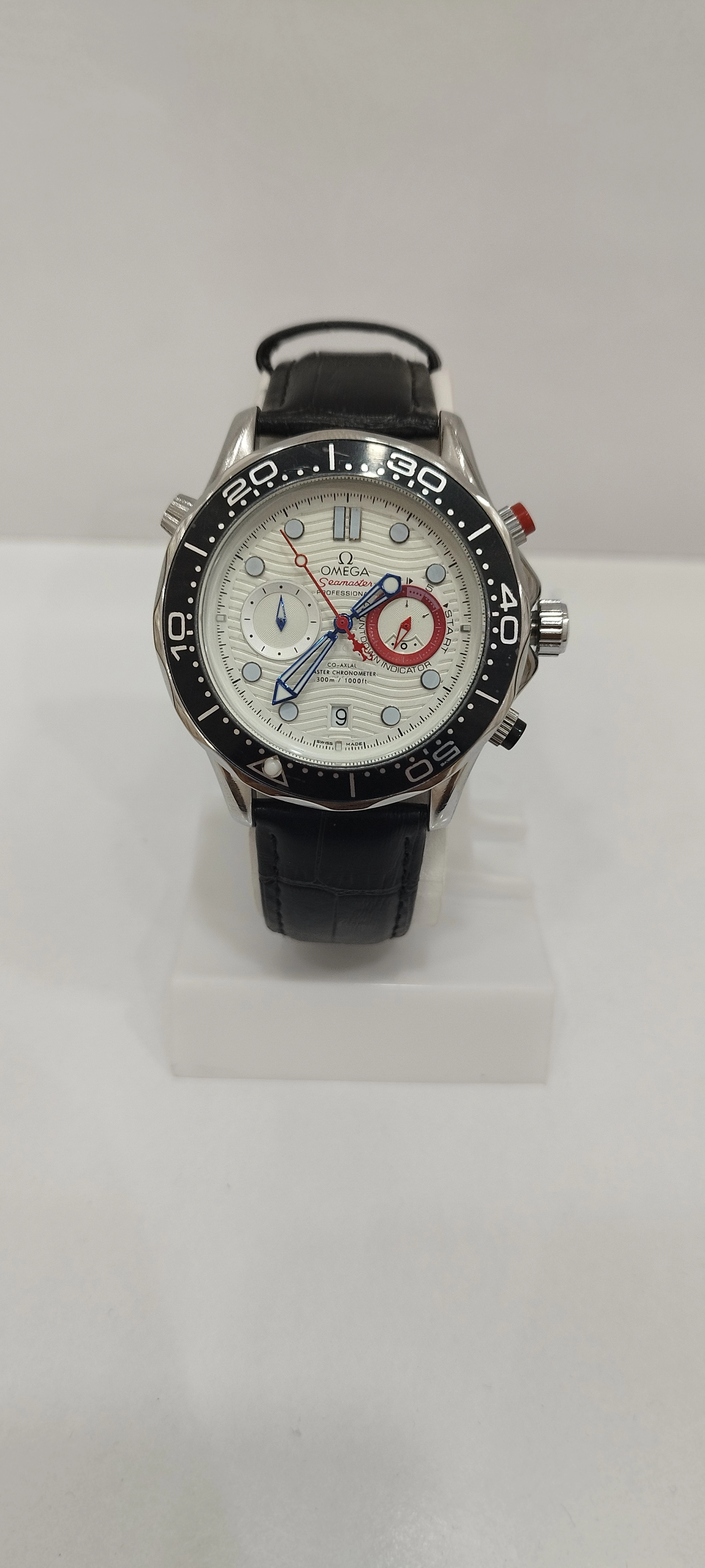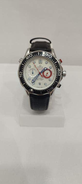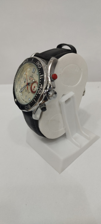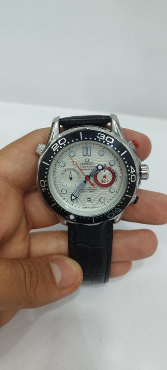 ساعت مچی مردانه برند امگا omega سه موتوره ضد آب در حد بند چرم اصل رنگ مشکی و صفحه سفید رنگ