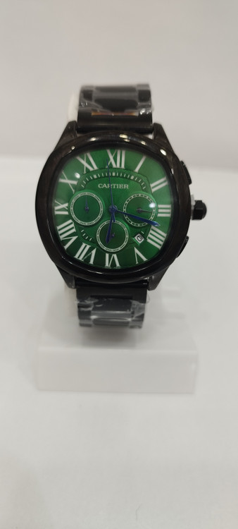 ساعت مچی مردانه و زنانه برند کارتیر CARTIER سه موتوره فعال ضد آب در حد بند فلزی استیل در رنگ مشکی و صفحه سبز رنگ