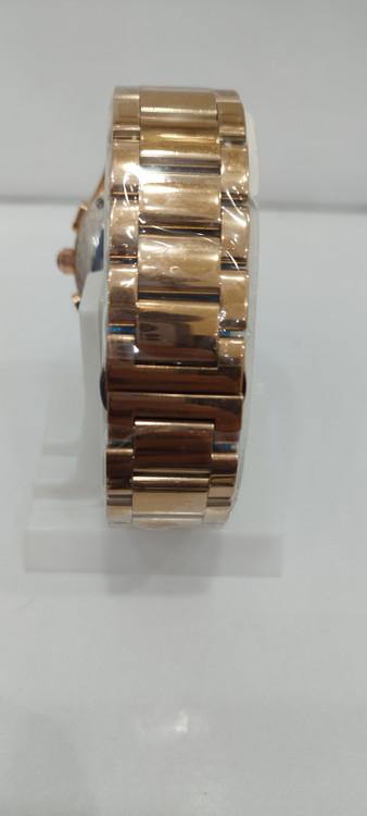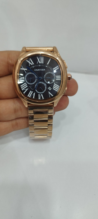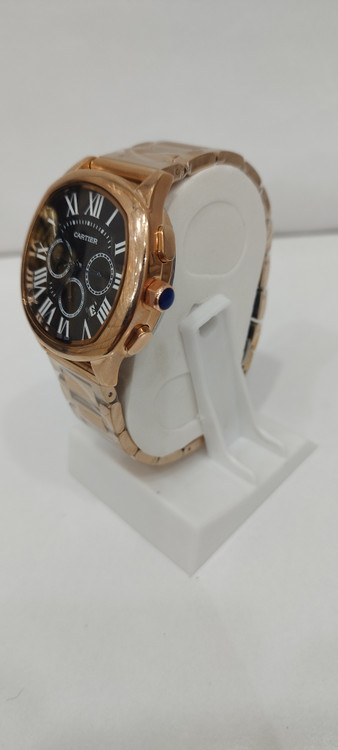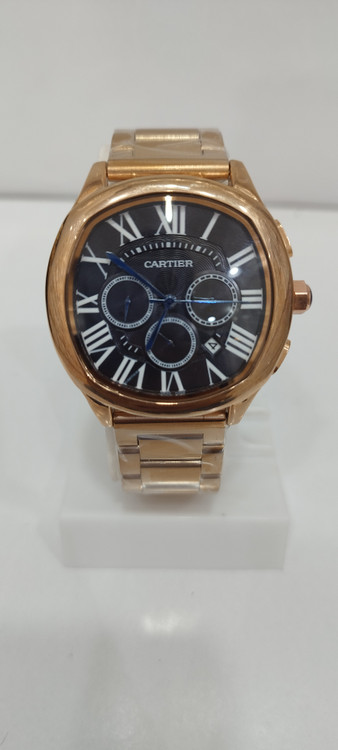 ساعت مچی مردانه برند کارتیر CARTIER سه موتوره فعال ضد آب در حد بند فلزی استیل در رنگ رزگلد دور صفحه رز گلد و صفحه مشکی رنگ.