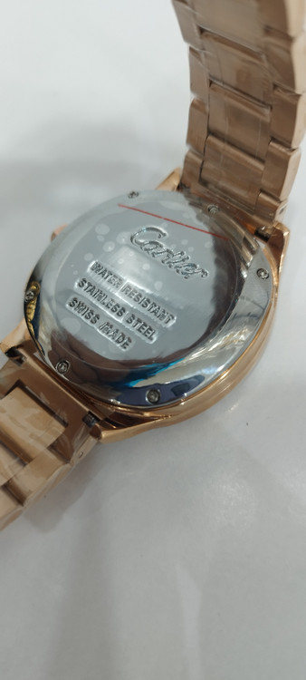 ساعت مچی مردانه برند کارتیر CARTIER سه موتوره فعال ضد آب در حد بند فلزی استیل در رنگ رز گلد و دور صفحه رزگلد و صفحه مشکی رنگ.