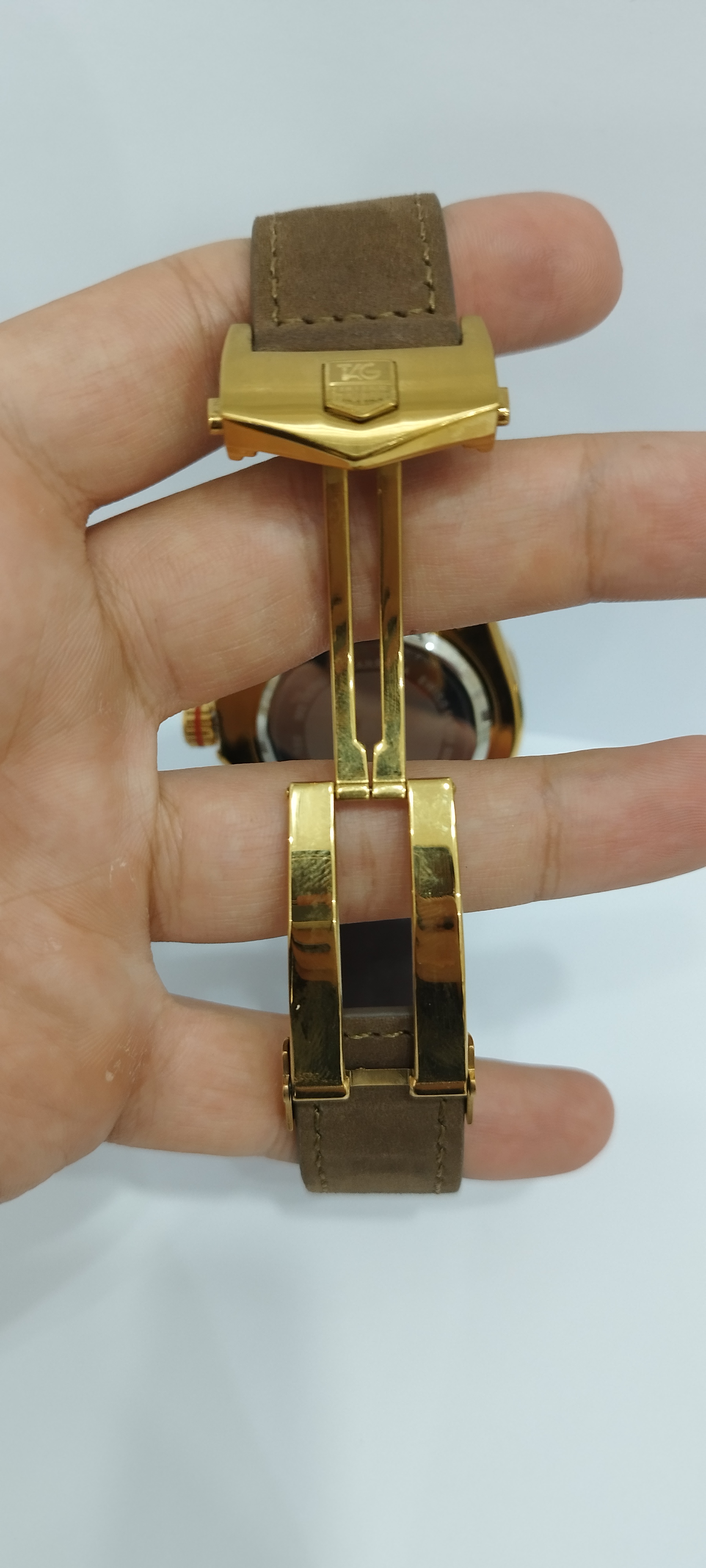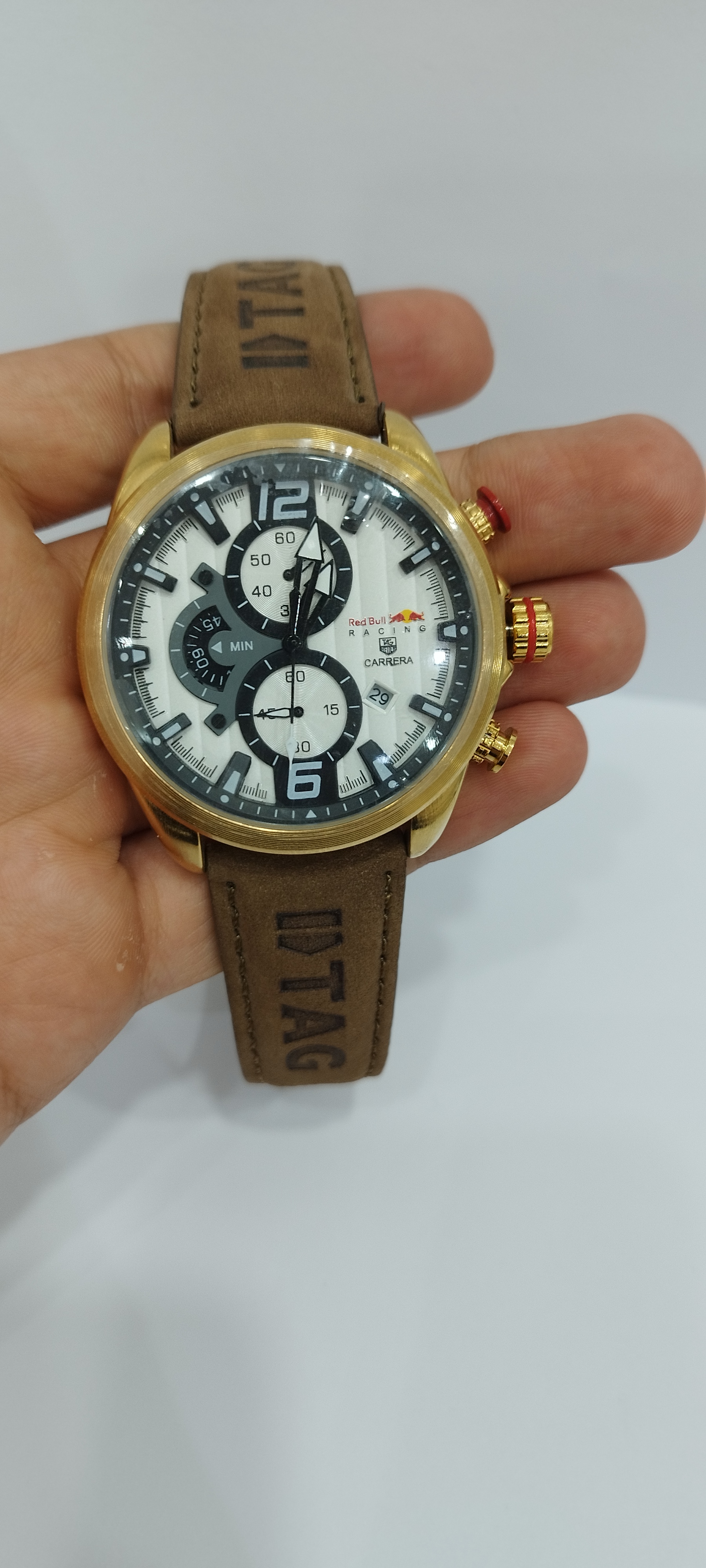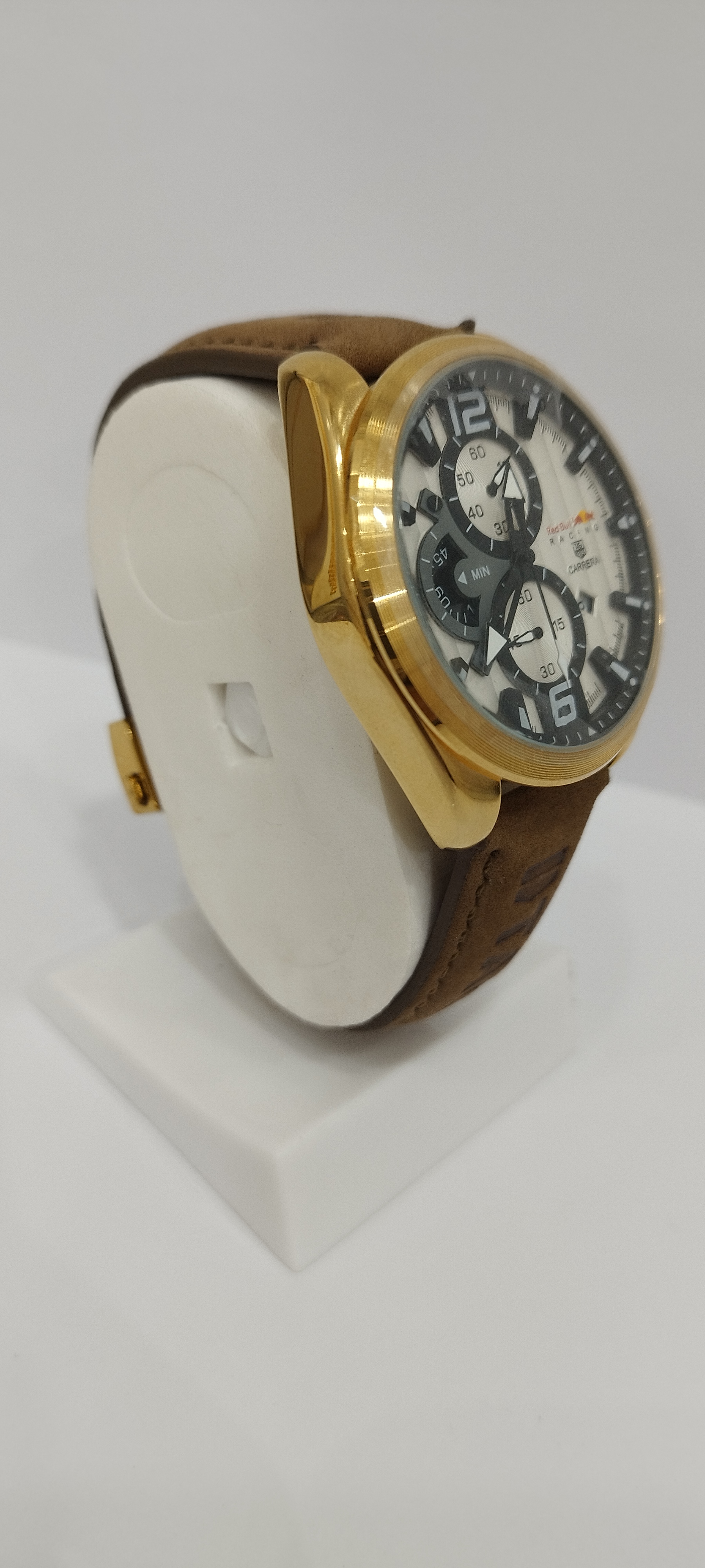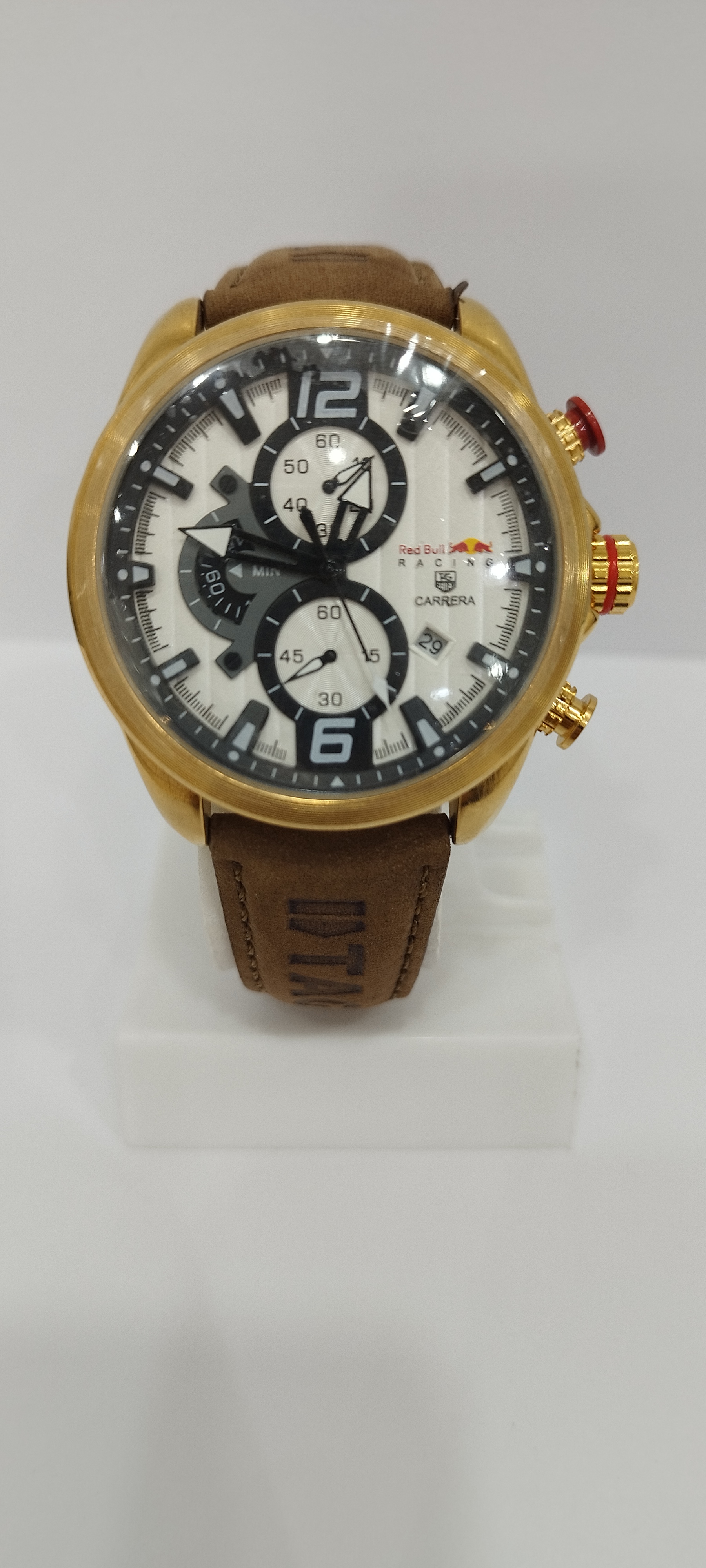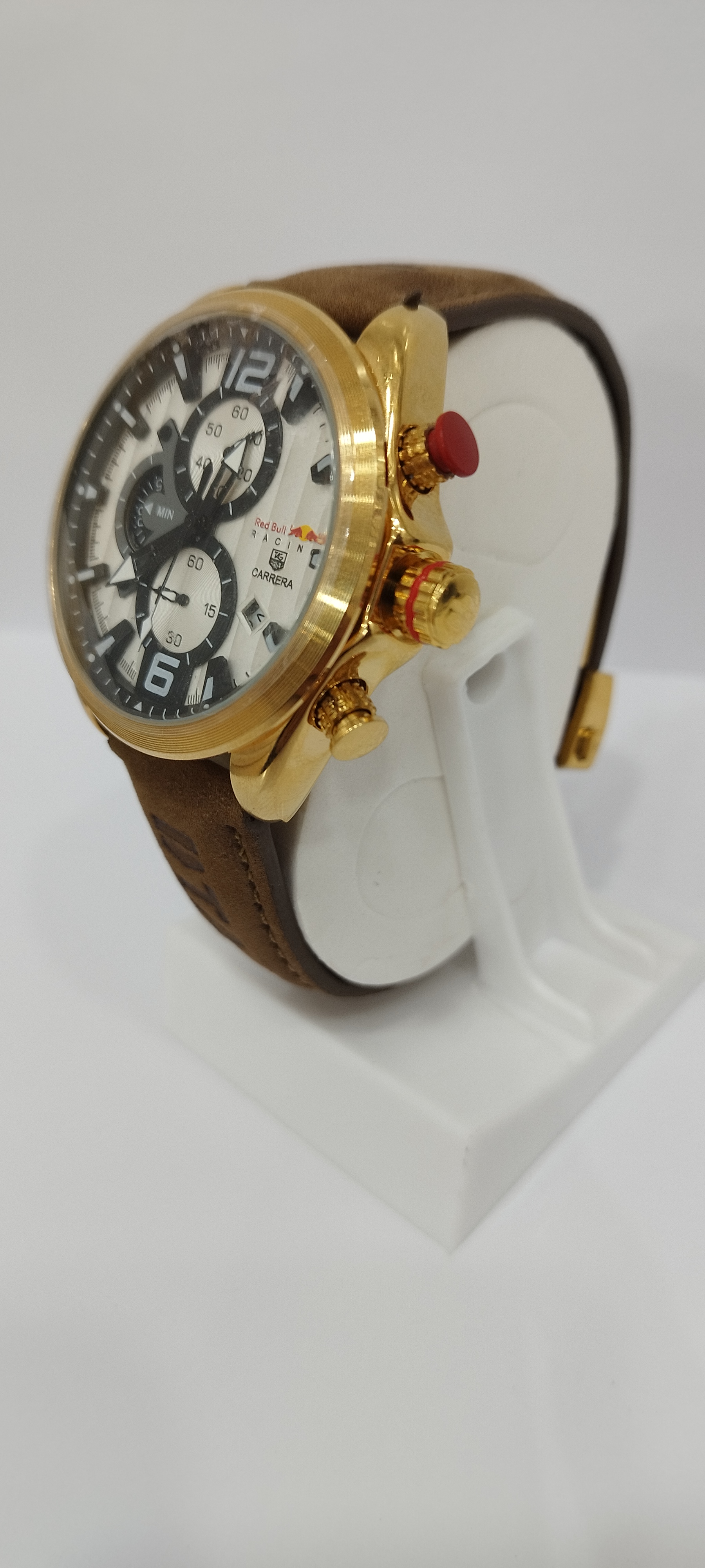 ساعت مچی مردانه برند رد بول راکینگ یا تک هویر Red Bull racing take huver سه موتوره فعال ضد آب در حد بند مخملی اصل رنگ قهوه ای و دور صفحه طلایی و صفحه سفید رنگ