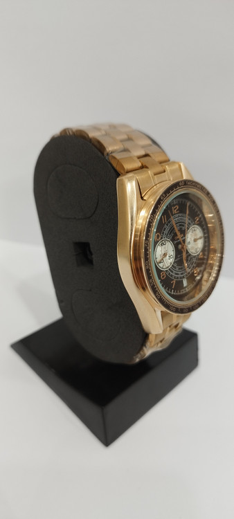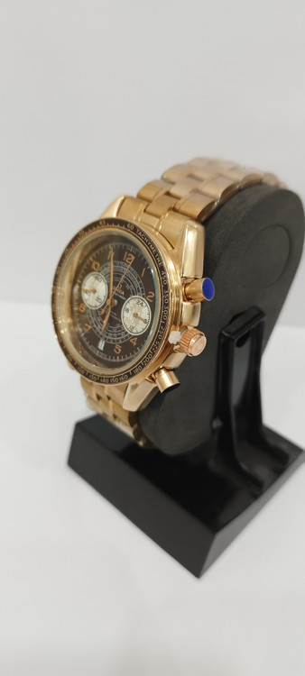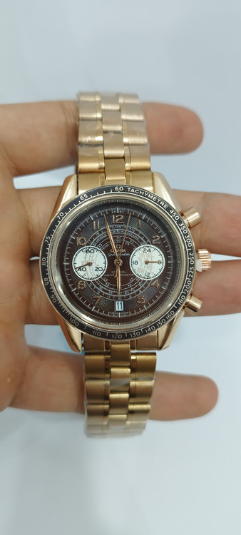 ساعت مچی مردانه و زنانه برند امگا OMEGA سه موتوره فعال ضد آب در حد بند فلزی استیل در رنگ رزگلد و دور صفحه رزگلد و صفحه قهوه ای تیره
