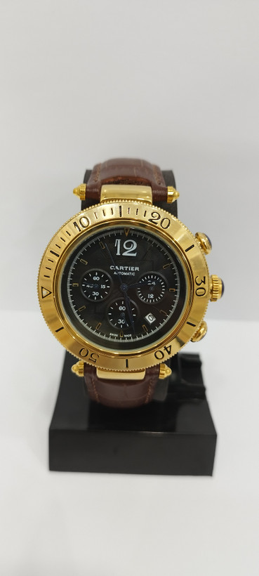 ساعت مچی مردانه و زنانه برند کارتیر CARTIER سه موتوره فعال ضد آب در حد بند چرم اصل رنگ قهوه ای دور صفحه طلایی و صفحه مشکی