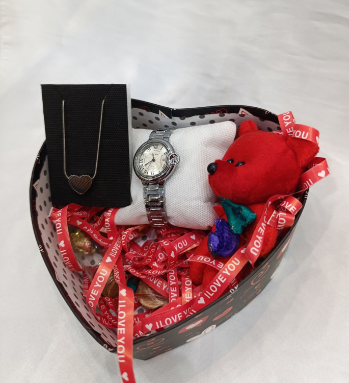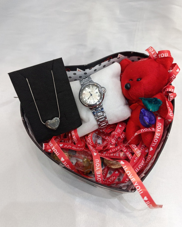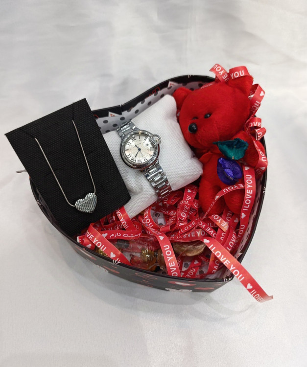 باکس کادو ولنتاین هدیه دخترانه ساعت و گردنبند ساعت برند کارتیر رنگ ثابت ضد آب در حد شستشو دو موتوره روز شمار دار قفل کلیپسی گردنبند برند ژوپینک رنگ ثابت ضمانت دار ضد حساسیت