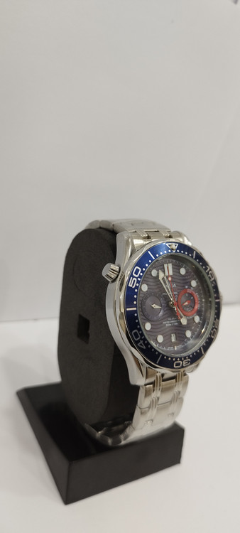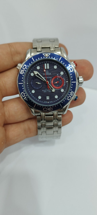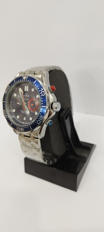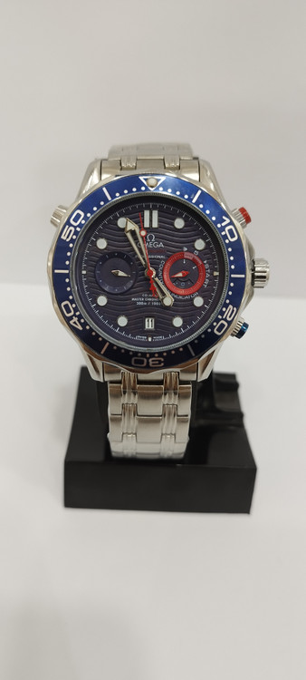 ساعت مچی پسرانه و دخترانه برند امگا سه موتوره فعال ضد آب در حد بند فلزی استیل در رنگ نقره ای و صفحه آبی رنگ