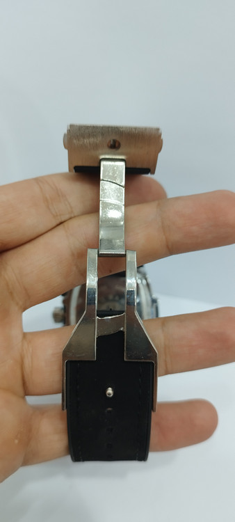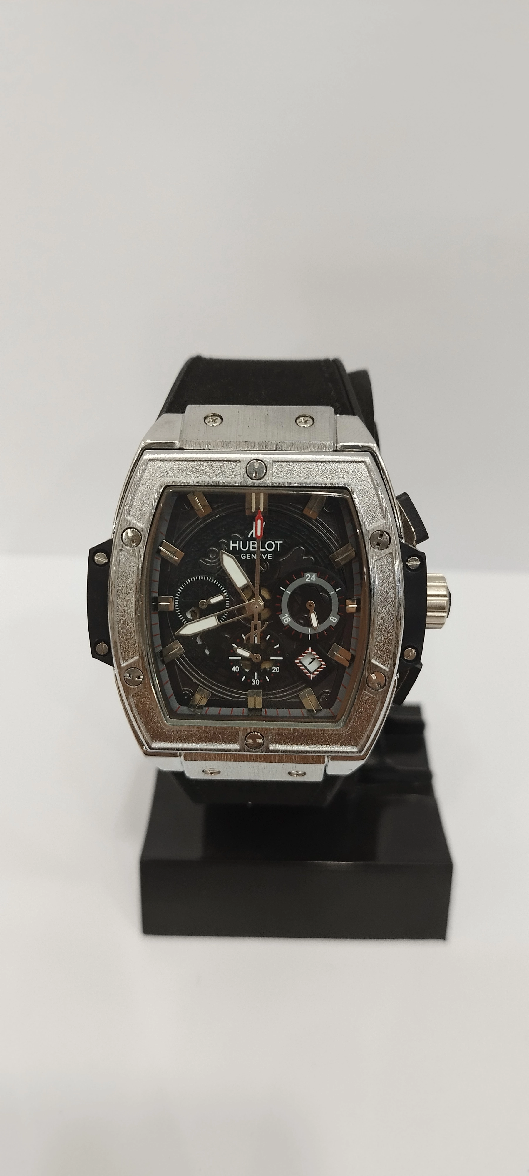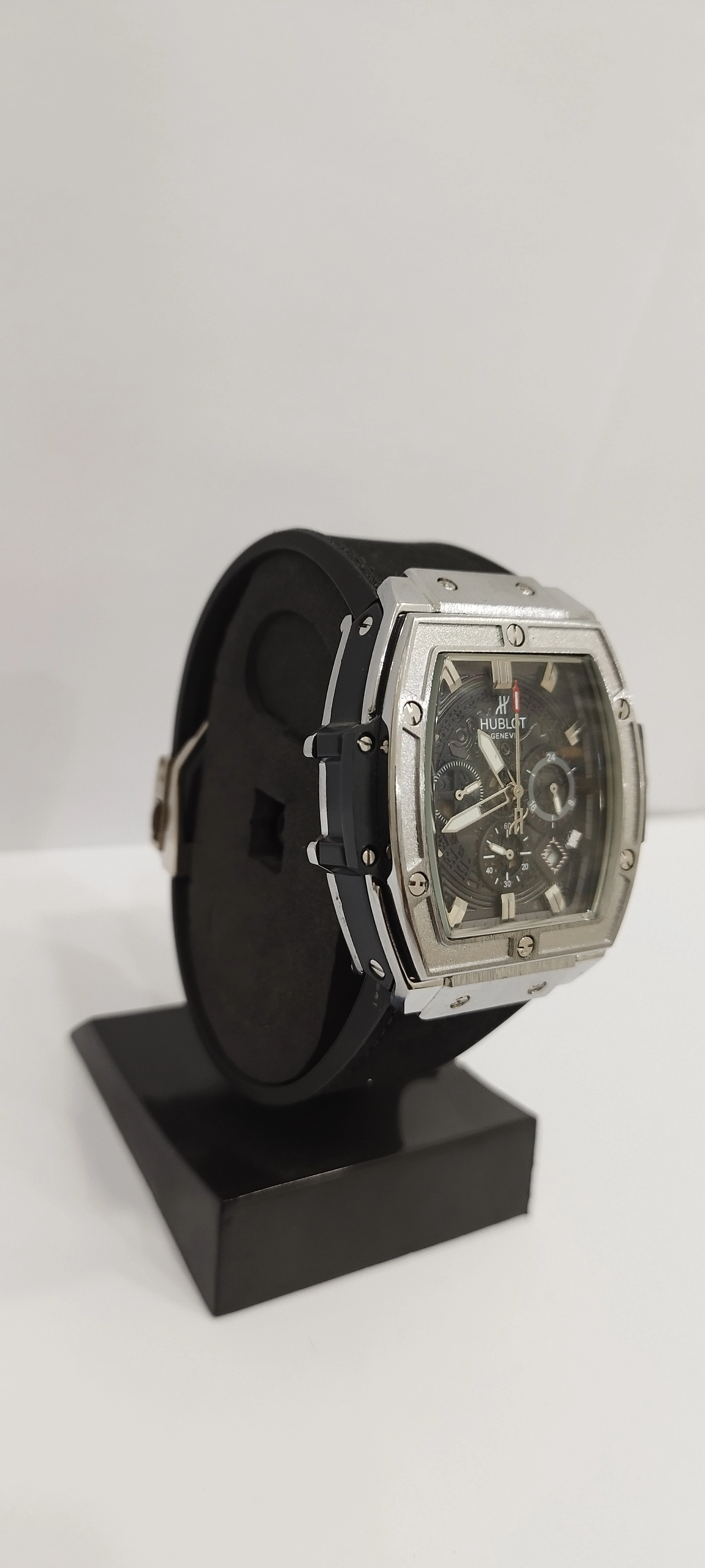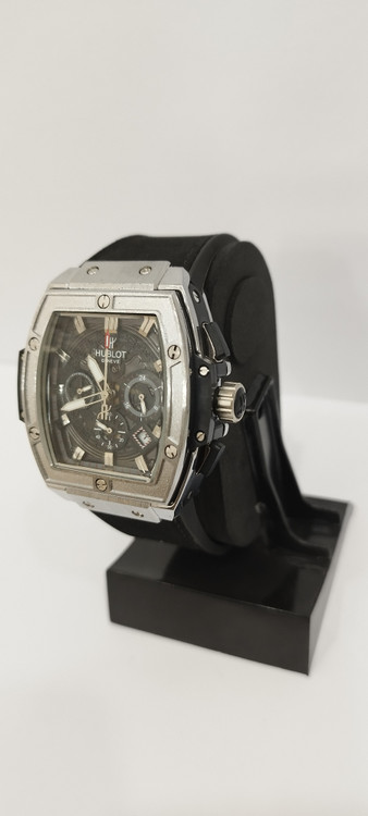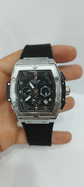 ساعت مچی پسرانه و دخترانه برند هابلوت سه موتوره فعال ضد آب در حد بند مخملی رنگ مشکی و دور صفحه نقره ای و صفحه مشکی رنگ
