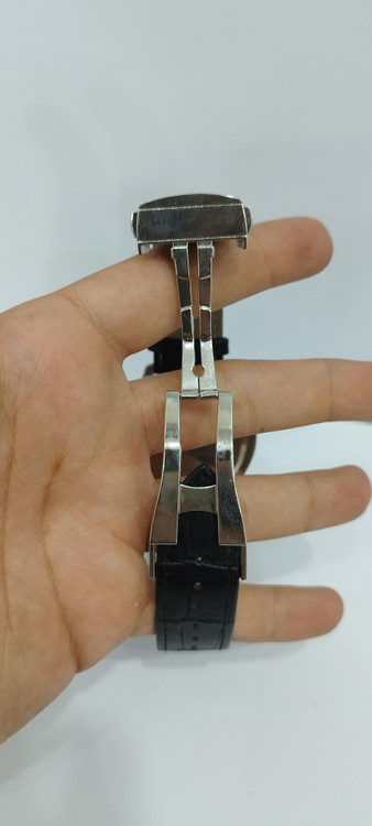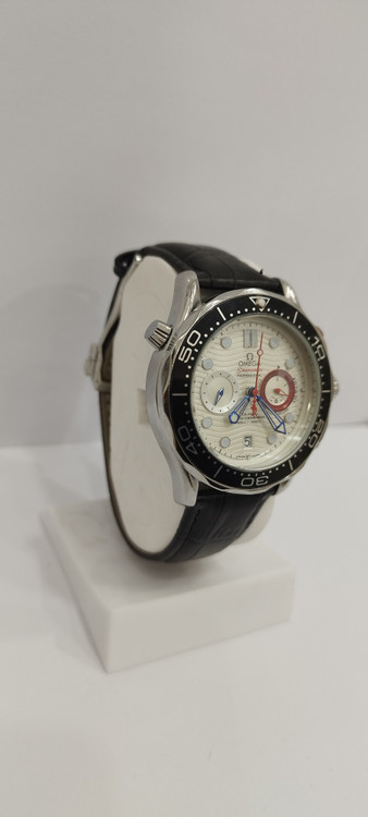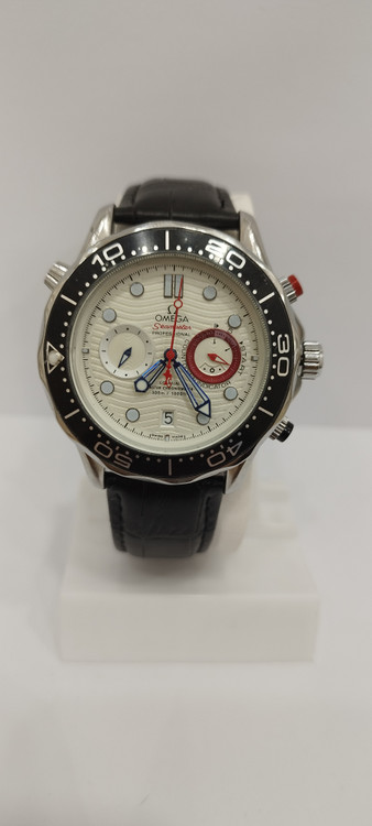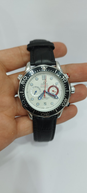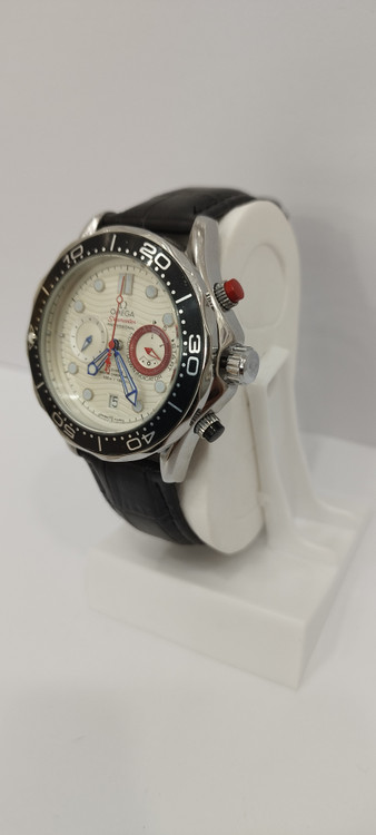 ساعت مچی پسرانه و دخترانه برند امگا سه موتوره فعال ضد آب در حد بند چرم اصل رنگ مشکی و دور صفحه مشکی و صفحه سفید رنگ