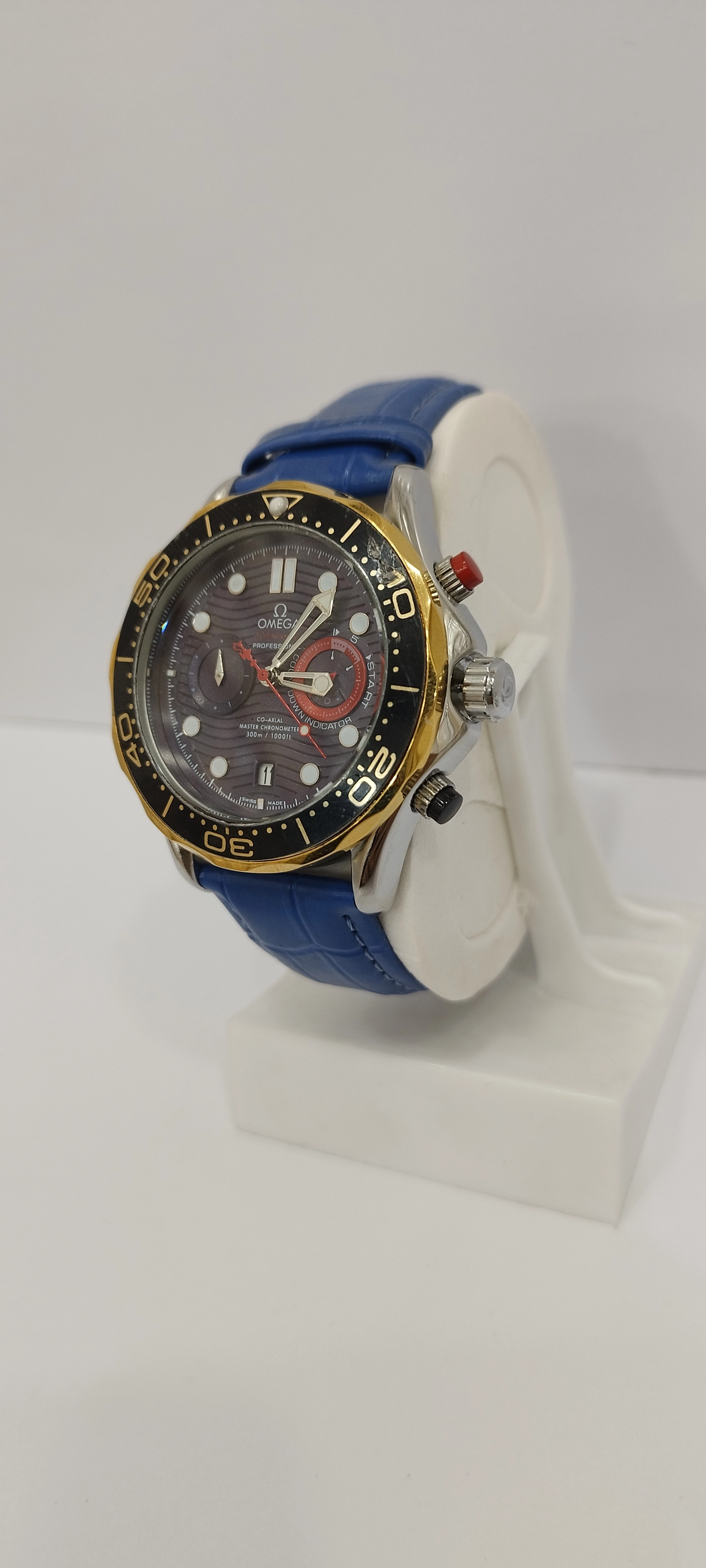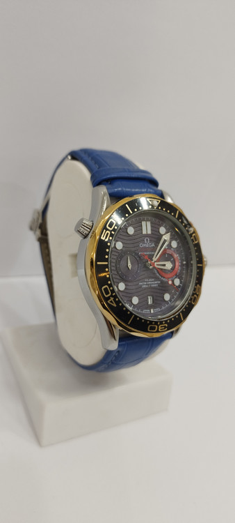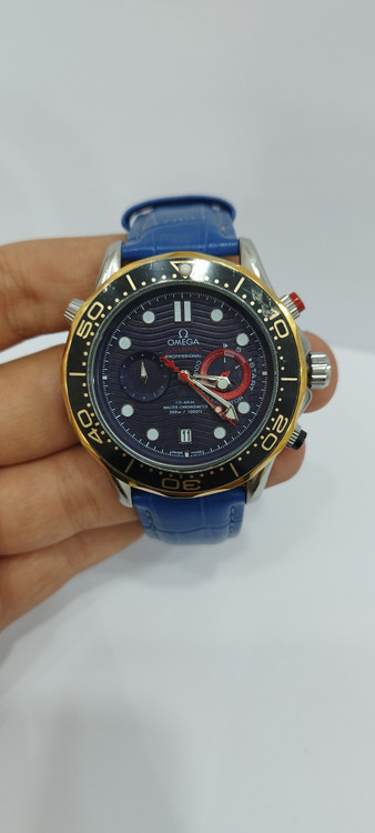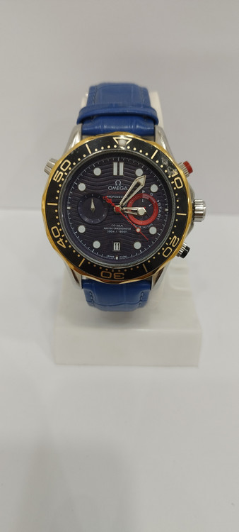 ساعت مچی پسرانه و دخترانه برند امگا سه موتوره فعال ضد آب در حد بند چرم اصل رنگ آبی دور صفحه مشکی طلایی و صفحه مشکی رنگ
