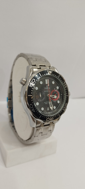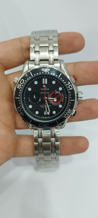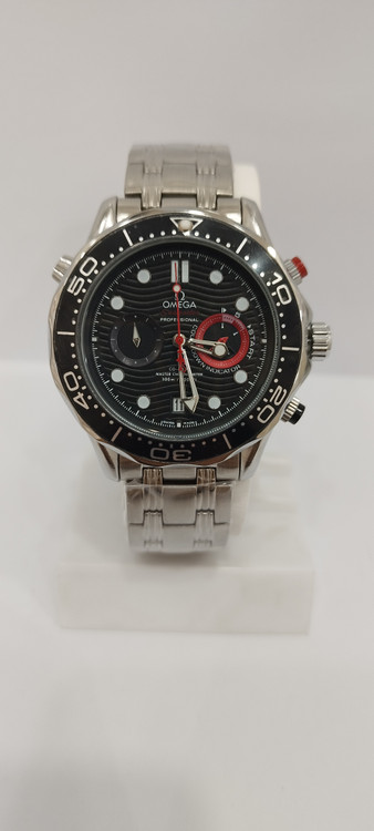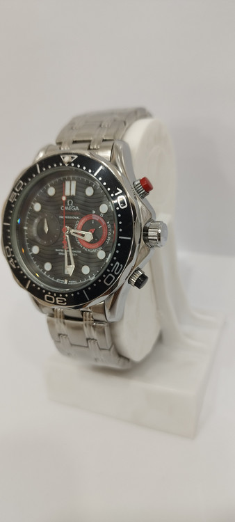 ساعت مچی پسرانه و دخترانه برند امگا سه موتوره فعال ضد آب در حد بند فلزی استیل در رنگ نقره ای و دور صفحه مشکی و صفحه مشکی رنگ