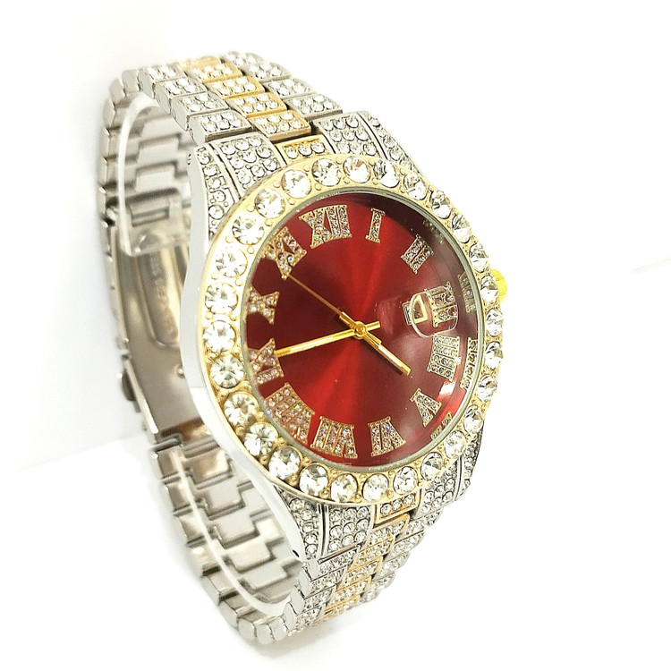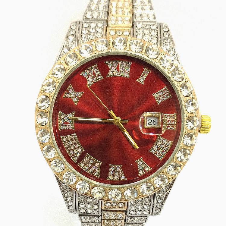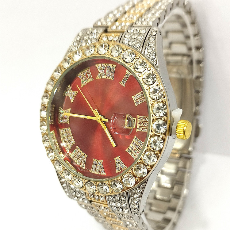 ساعت مچی نگین دار دخترانه و پسرانه فول نگین رنگ نقره ای و طلایی صفحه نگین کاری شده دور صفحه نگین دار صفحه گرد رنگ صفحه قرمز شیشه کریستال تلسکوپی ضد خش ضد آب در حد شستشو روز شمار و تقویم دار موتور کوارتز بند فلزی استیل قفل کلیپسی ضامن دار.