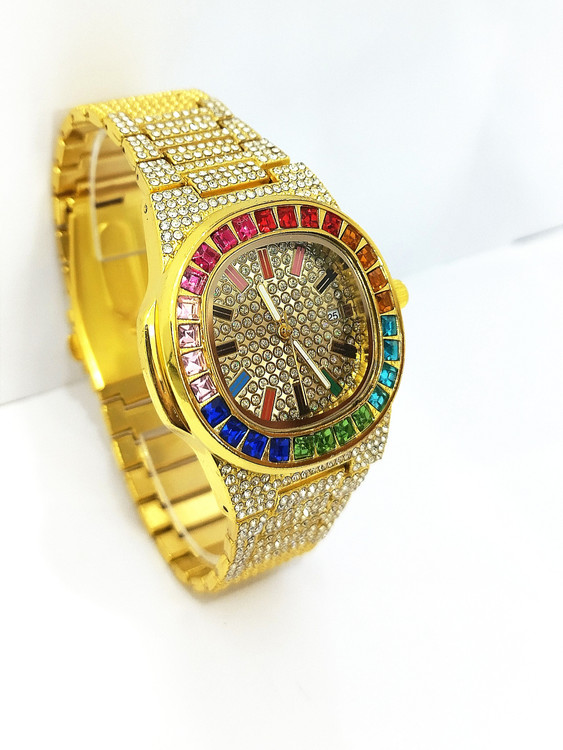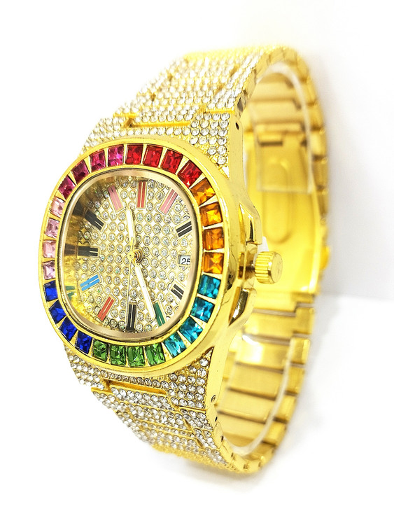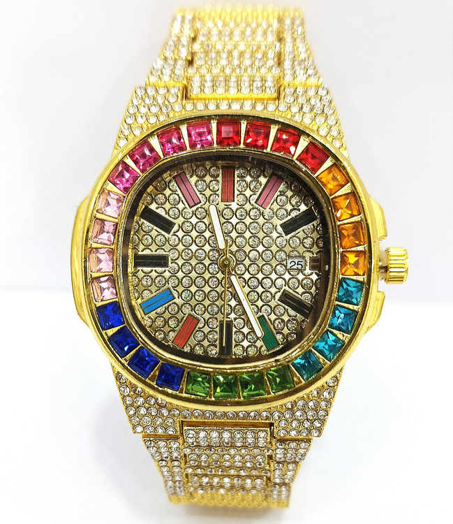ساعت مچی نگین دار دخترانه نگین کاری شده بند فلزی استیل در رنگ طلایی دور صفحه نگین رنگین کمانی شده صفحه نگین کاری شده صفحه چهار ضلعی شیشه کریستال تلسکوپی ضد خش ضد آب در حد شستشو روز شمار و تقویم دار قفل کلیپسی ضامن دار.