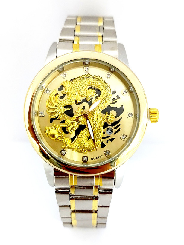 ساعت مچی پسرانه و دخترانه طرح داراگون (اژدها) بند فلزی استیل در رنگ سفید و دور صفحه طلایی رنگ و صفحه طلایی و مشکی رنگ همراه با نگین کاری و طرح صفحه داراگون برجسته شیشه کریستال تلسکوپی ضد خش ضد آب در حد روز شمار و تقویم دار موتور کوارتز و قفل کلیپسی ضامن دار موتور شرکتی اصل نوع کار موتورهمراه باتری.