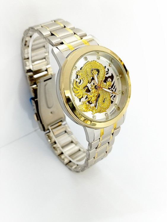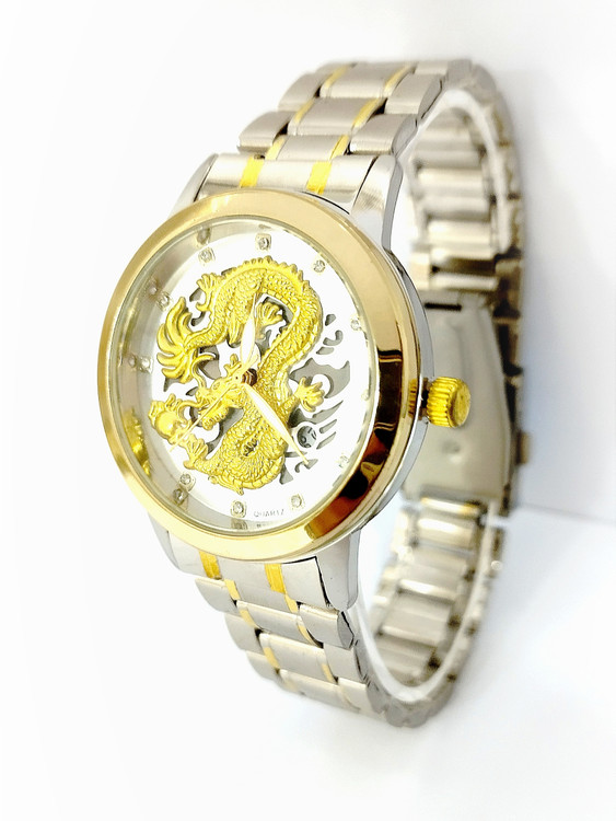 ساعت مچی پسرانه و دخترانه طرح داراگون (اژدها) بند فلزی استیل در رنگ سفید و دور صفحه طلایی رنگ و صفحه سفید صدفی طلایی مشکی رنگ همراه با نگین کاری و طرح صفحه داراگون برجسته شیشه کریستال تلسکوپی ضد خش ضد آب در حد روز شمار و تقویم دار موتور کوارتز و قفل کلیپسی ضامن دار موتور شرکتی اصل نوع کار موتورهمراه باتری.